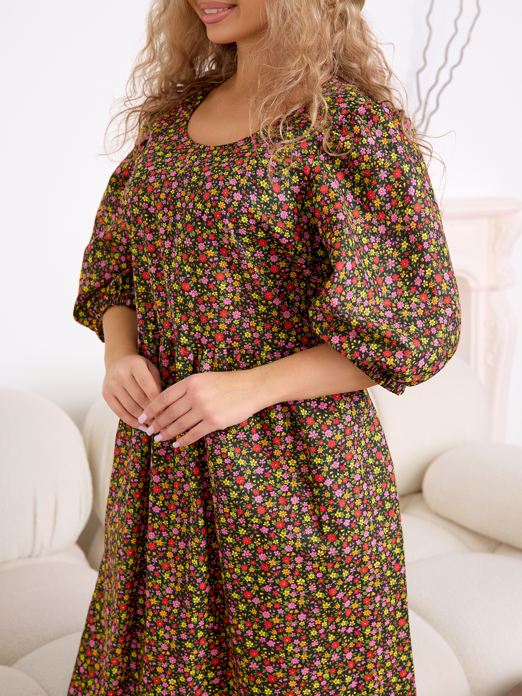 Рукав 3/4 с резинкой внизу — практичная и стильная деталь, которая завершает образ в духе «платья-крестьянки».